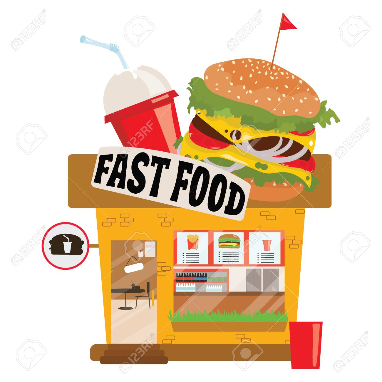 Uncategorized Fast Food Restaurant Cartoon Images Uncle sam america and eat burger fast food cartoon restaurant waiter and waitress with fast food hot dog and sauce cartoon vector illustration graphic design